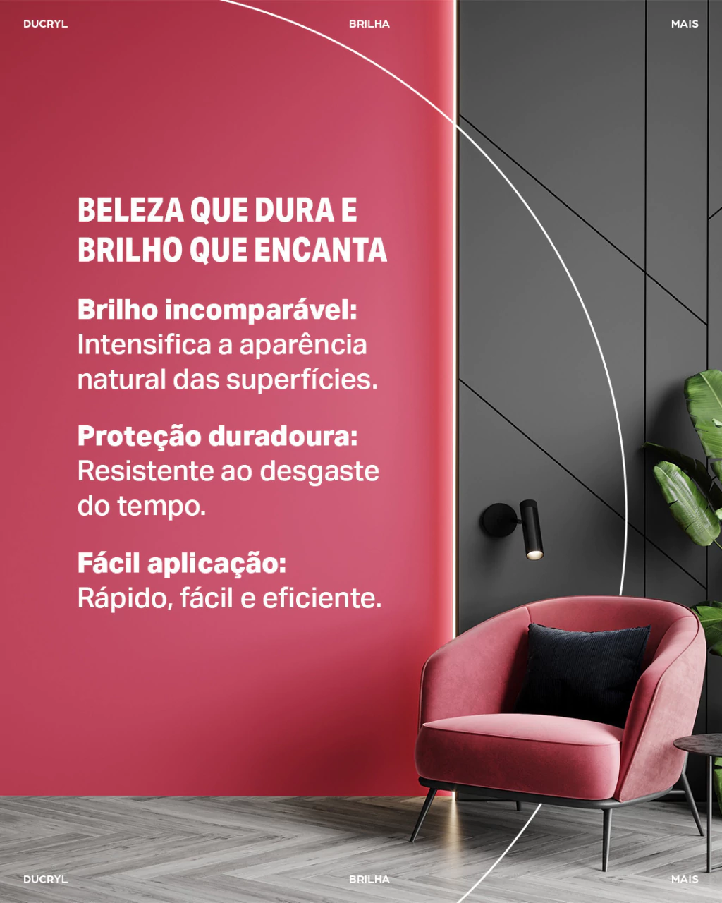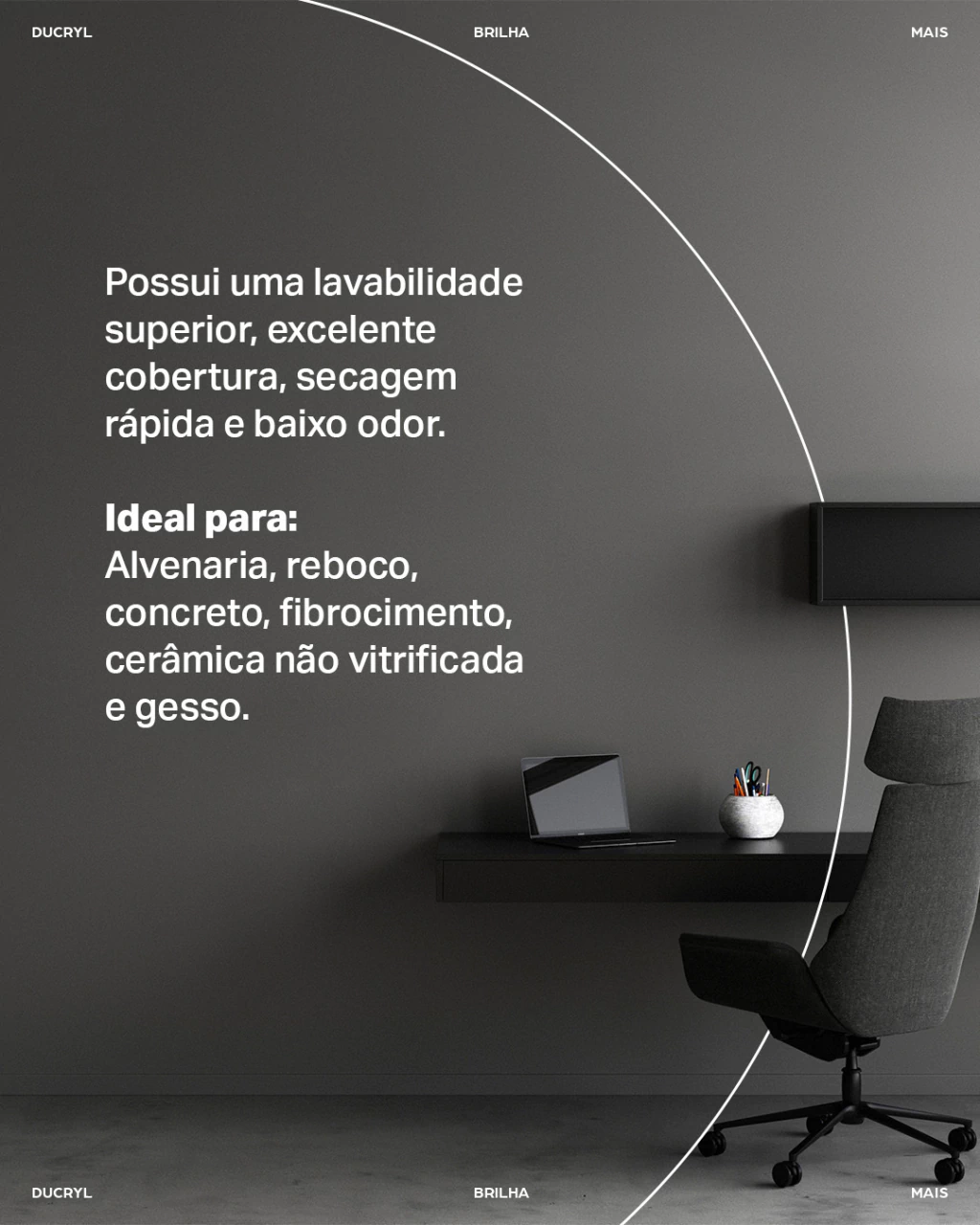 Ducryl Mais Brilho e Mais Durabilidade foi especialmente desenvolvida para conceder maior proteção e brilho as paredes do seu lar. Apresenta lavabilidade superior para maior facilidade na remoção de sujeiras, excelente cobertura, rápida secagem, baixo odor e é fácil de aplicar.
